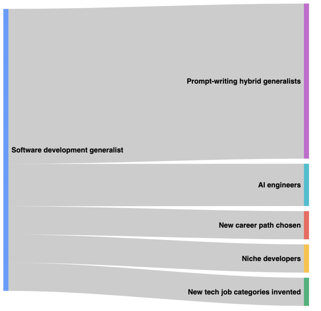 Basic economics prevails. Salaries are going up for AI talent because there aren’t enough people with the skills to do the work. To capitalize on this opportunity, some people will reskill towards opportunity. But the bar is higher for AI jobs*. Most skills shifting for software developers will be towards improved prompt writing within AI development environments like Devin and integrating with AI platform APIs. As prompt writing skills and generative AI improves, developers will be in competition with product managers, designers, and researchers for jobs that traditionally were theirs alone.